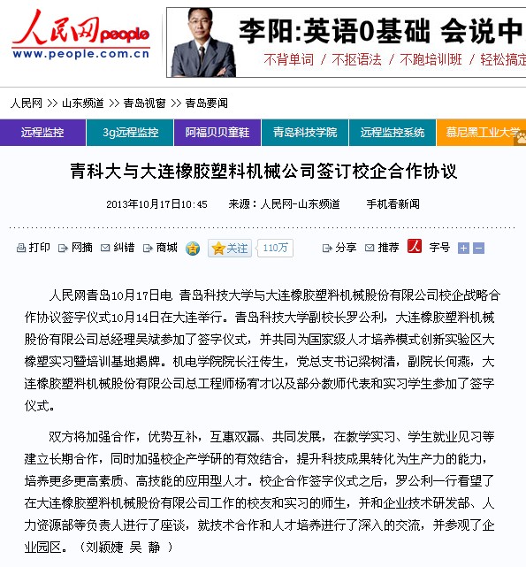 11月14日,免费性爱片 与大连橡胶塑料机械股份有限公司校企战略合作协议签字仪式在大连举行。