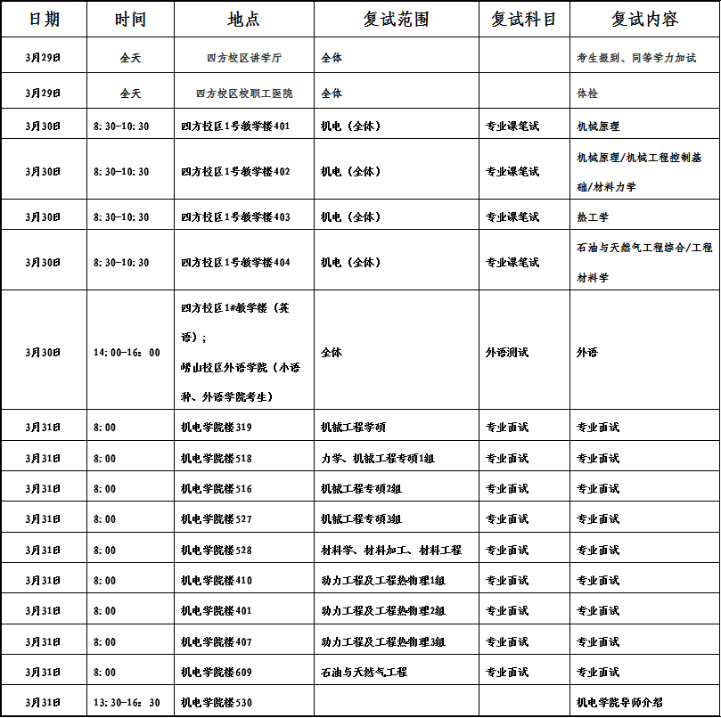 说明: 3月29日报到时,请在报到处--免费性爱片 举牌位置填写报到登记详情表;3月30日专业课考试科目《机械原理》的考生请自带绘图工具;3月31日专业面试分组名单详见当天免费性爱片 楼一楼张贴,各复试专业按照公布名单的顺序依次进行,政审表在面试时请交于各组政审老师;529房间为考生面试候场处。