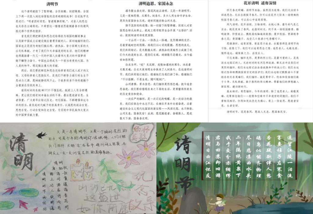 天地英雄气,千秋尚凛然——开展“清明寄哀思”征文活动。组织学生学习先辈伟大事迹,通过传统的纸质媒介或者线上渠道与英烈对话,进一步提高思想觉悟,坚定理想信念,从先烈光辉的事迹中汲取不畏强敌、不畏风险、敢于斗争、奋勇向前的勇气与力量。同时,学院开展“家国清明,春满人间”手抄报征集活动,将收集到的事迹用手抄报、海报的形式表达出来,以先辈先烈为镜,不断筑牢信仰之基、补足精神之钙、把稳思想之舵。