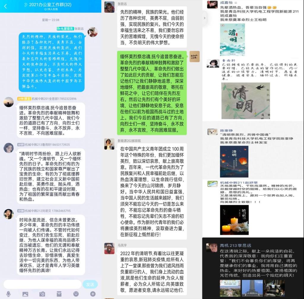 缅怀先烈志,共筑中国魂——开展“铭记历史,追思先烈”主题感悟分享会。同学们纷纷在班级QQ群、微信群中表达对于先烈的纪念与致敬。免费性爱片