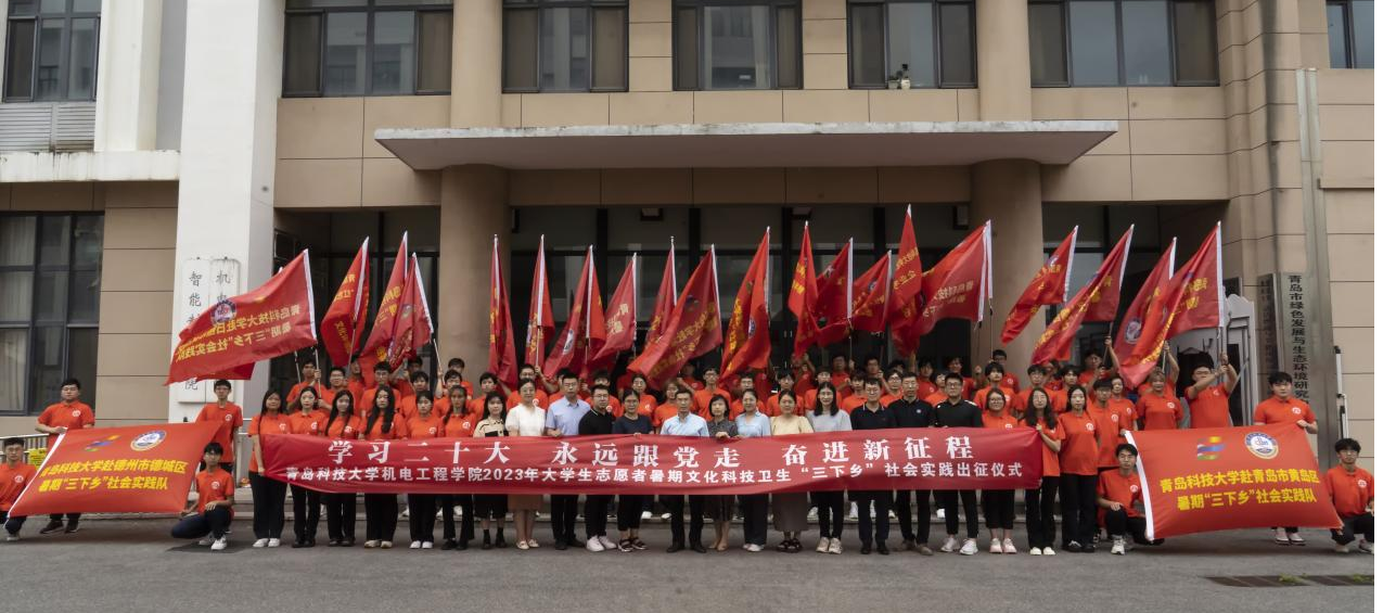 2023年暑期大学生志愿者科技、文化、卫生三下乡社会实践出征仪式在机电楼530隆重举行,学院党委副书记兼副院长肖强、团委书记兼学工办主任王娟娟、实践团队指导教师代表和学生代表参与仪式。