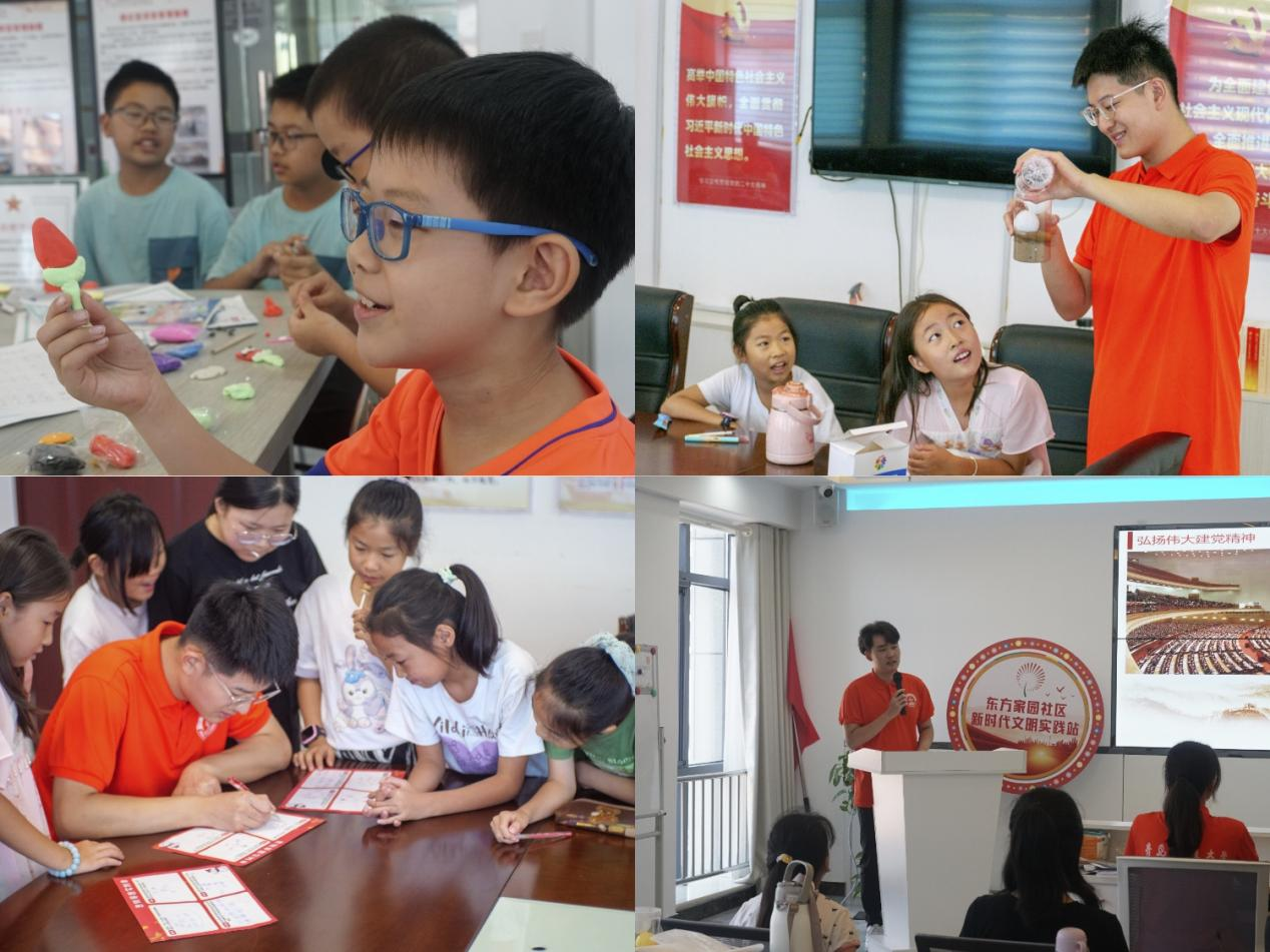 在专业志愿者的指导下,开展“七彩梦·艺术之旅、“共绘未来”、“彩塑梦想”等主题活动引导孩子们用画笔、彩泥、歌曲表现对生活的向往和热爱,孩子们热情地挥动画笔,尽情发挥想象,挑战各种独特的色彩搭配,在笔触间演绎着色彩斑斓的梦想和追求,展现出“敢想敢为又善作善成”的独特风采,通过“击鼓传花”等小游戏,传唱红色歌曲,唱响青春主旋律,奏出时代最强音。