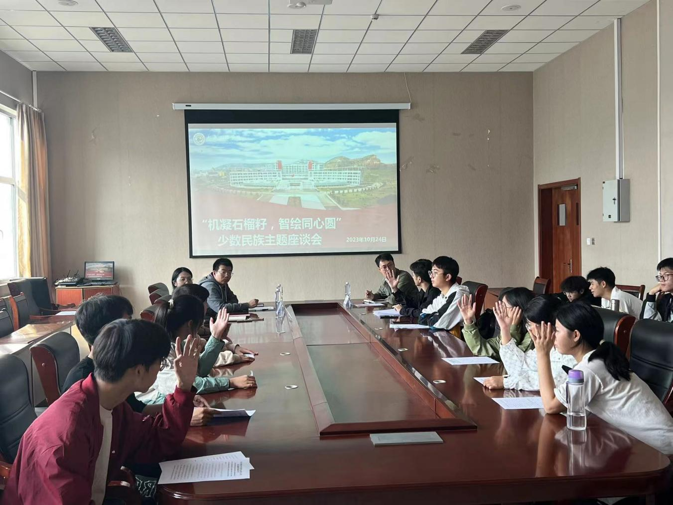 518会议室举办“机凝石榴籽智绘同心圆”少数民族主题座谈会,学院全体新生少数民族学生及大一年级辅导员参加座谈会。