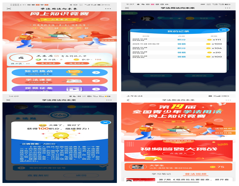 学院组织学生积极参与第19届全国青少年学法用法网上知识竞赛,参与人数达730余人,以赛促学,引导学生利用法律解决问题,勇当“宪法卫士”,真正做到学以致用。
