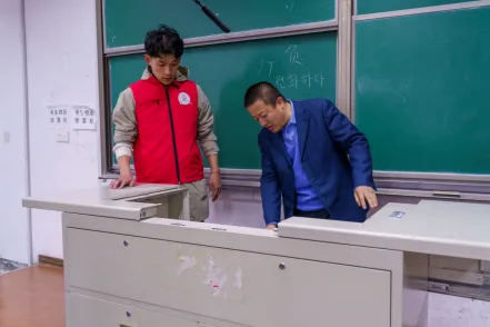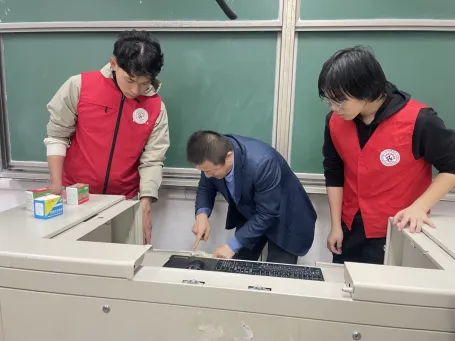 主题教育实践在明德楼302开始,参加师生一起研究讲台及设备清理标准、制定清理步骤和成果验收流程,让每一个志愿者了解志愿服务工作有标准、有流程、有效果。最终大家一致认为黑板、电脑、台面是清理重点,讲台内部的电子设备在确保安全的前提下进行浮尘清理。
