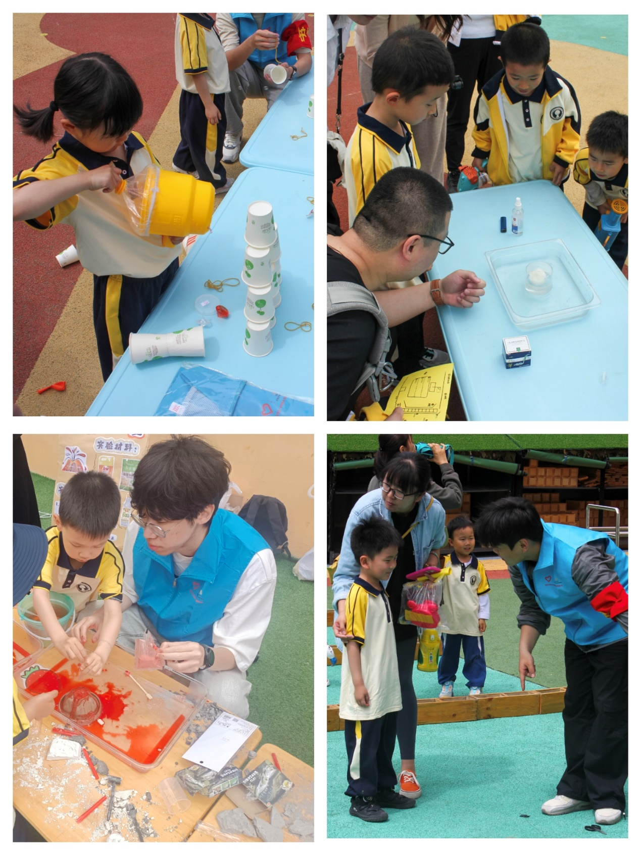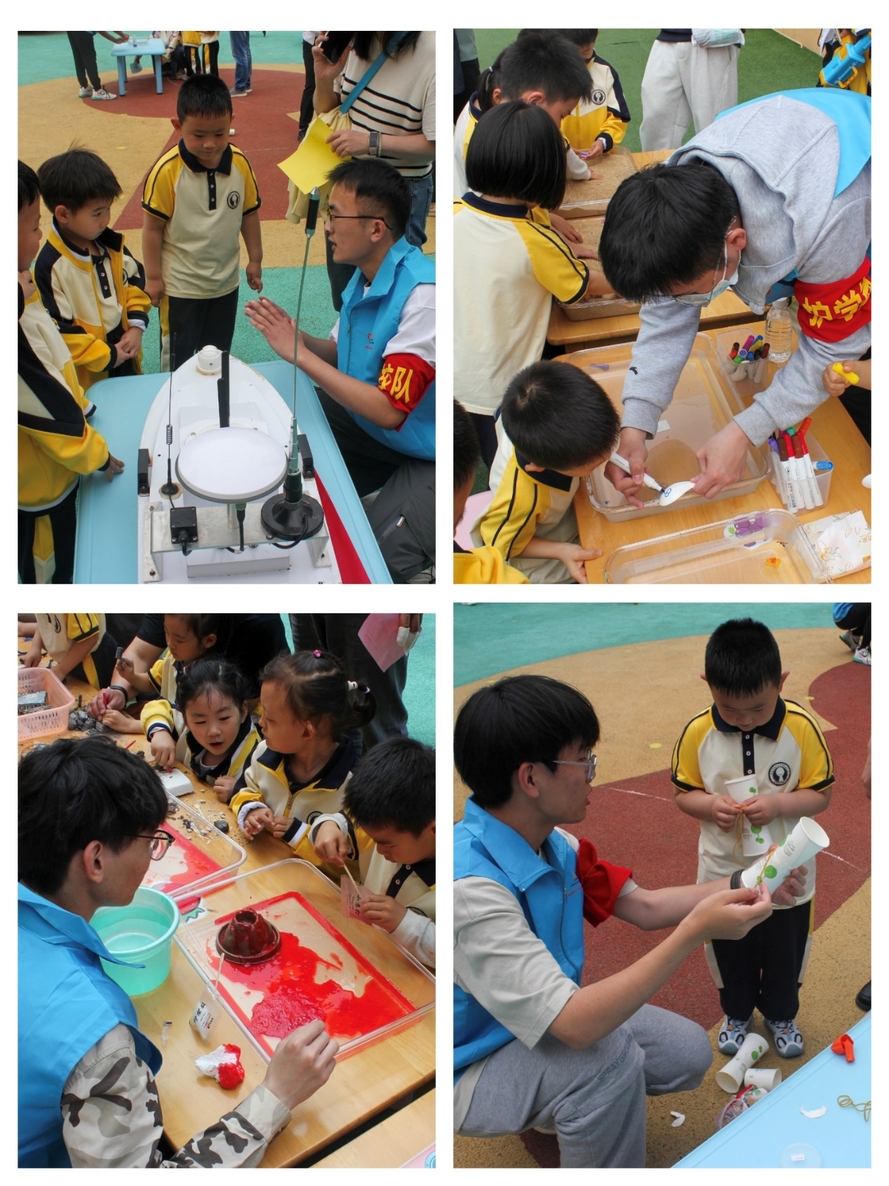 青苗科技创新团队成员的志愿者们在学院教师的精心组织下,小朋友们井然有序地排队参观了一系列充满科技魅力的项目。他们首先参观了无人艇模型,随后进行了空气炮实验,接着又动手制作了纸杯飞机,体验了蜡烛吸水等科学小实验。在这一系列活动中,志愿者们耐心细致地为小朋友们讲解了其中的科学原理和知识,包括无人艇的精巧构造和工作原理,空气炮的内部结构以及运作机制,气体热胀冷缩的自然规律。每个小实验都引发了小朋友们浓厚的兴趣,他们聚精会神地观察实验现象,动手进行实践操作,并积极向志愿者们提出自己的疑问。现场氛围既热烈又活泼,充满了孩子们对科学知识的渴望和探索精神。
