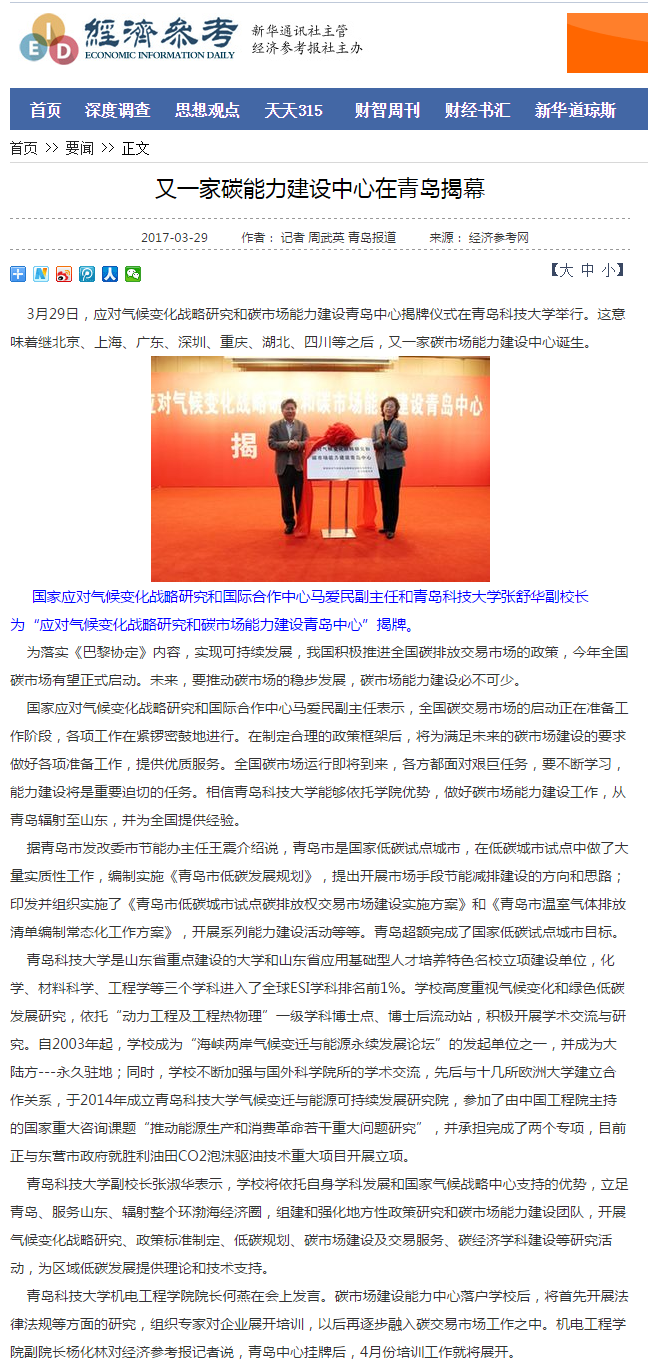 [经济参考报]又一家碳能力建设中心在青岛揭幕