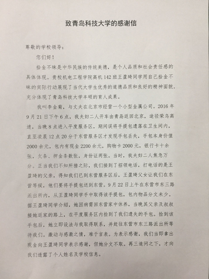 据了解,王盈琦平时是一个做事低调,富有责任心、乐于助人的人。她拾金不昧的行为,反映了学校学生良好的道德情操和社会责任感,是学校思想道德培养成果的一个缩影,她的高尚行为在校园里树立了良好的榜样。