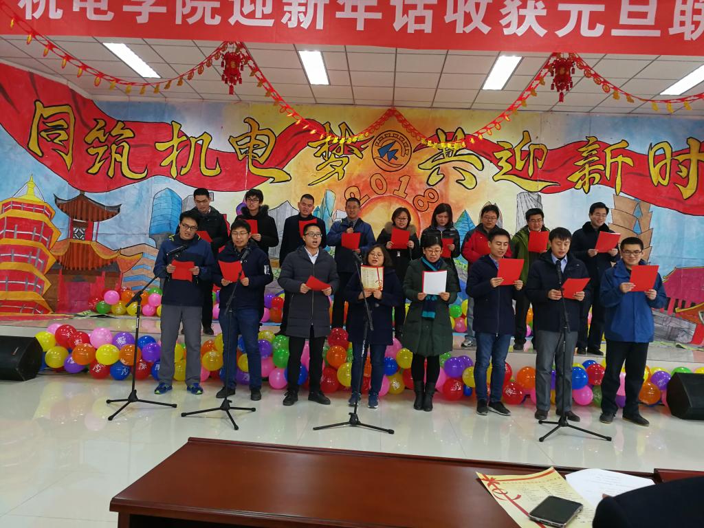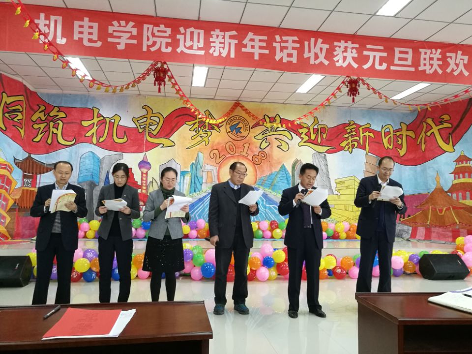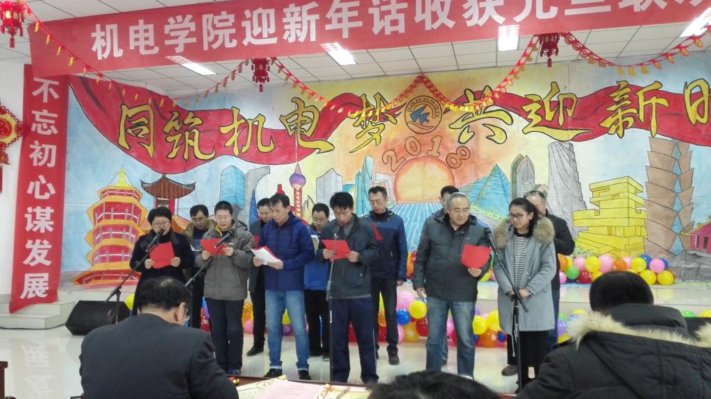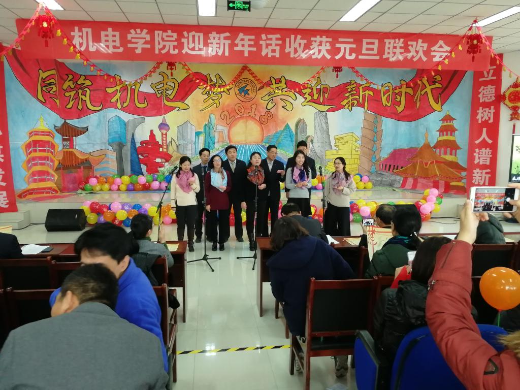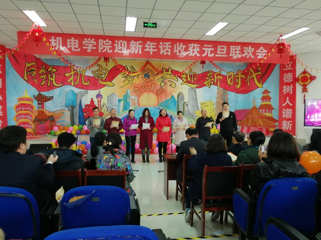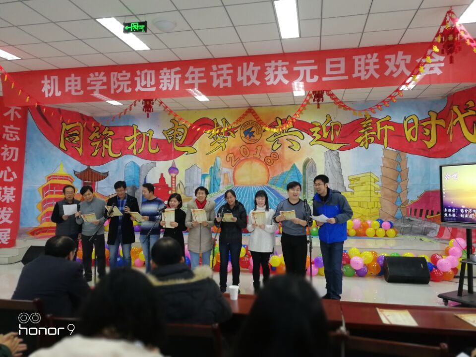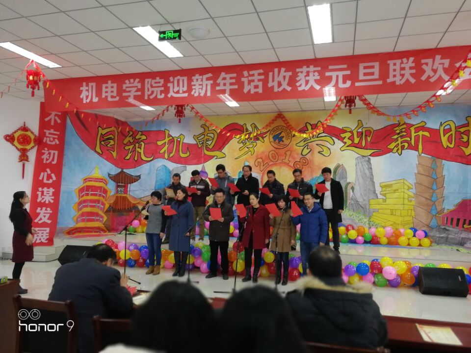 分团委老师带来的一段舞蹈《好运来》拉开了元旦联欢会的序幕,搞笑欢快的动作让现场的气氛顿时活跃起来。《歌唱祖国》、《真心英雄》等一曲曲合唱展现了各教研室老师的多才多艺,活力迸射的精神面貌。学院党政领导诗朗诵《歌颂机电》声情并茂,激昂澎湃,体现了对机电的热爱和作为机电人的自豪。一曲《好人一生平安》唱出了全体老师们的新年祝福,祝福大家平平安安、幸福喜乐,同时将本次晚会的娱乐气氛推向高潮。一首首动听的歌曲,一段段优美的舞蹈,洋溢着欢笑的会议室,最后联欢会在《明天会更好》的悠扬音乐中落下帷幕。