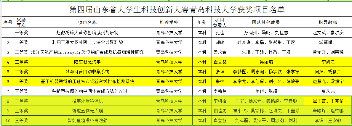 据悉,第四届山东省大学生科技创新大赛由山东省教育厅主办,面向驻鲁普通高校正式学籍的全日制在校本科生、专科生,共分实验过程创新、创意产品创新、实物产品创新和生产过程创新四大类。学校经过校内选拔赛、校内作品完善等环节,共申报作品190件,进入省赛网络评审57件,进入现场决赛19件,最终获奖10件。根据《山东省大学生科技创新大赛奖励办法》(鲁教科发[2015]2号)文件精神,对山东省大学生科技创新大赛中获奖作品的作者给予奖励,一等奖10000元,二等奖8000元,三等奖5000元;对山东省大学生科技创新大赛中获奖作品的指导教师给予奖励,一等奖5000元,二等奖4000元,三等奖3000元。