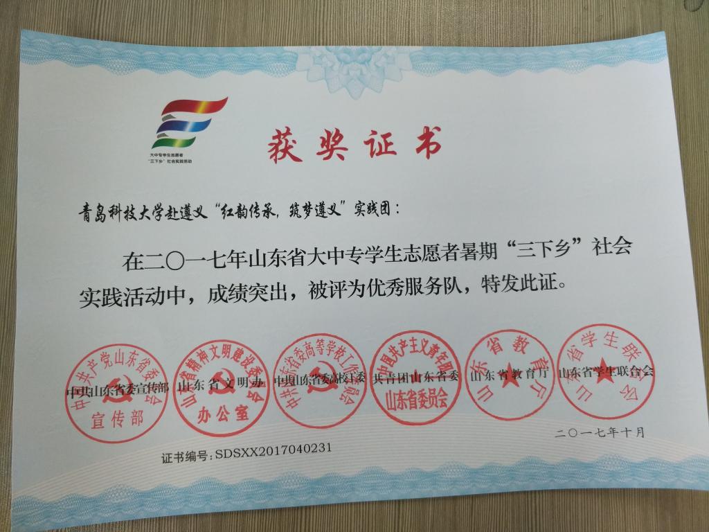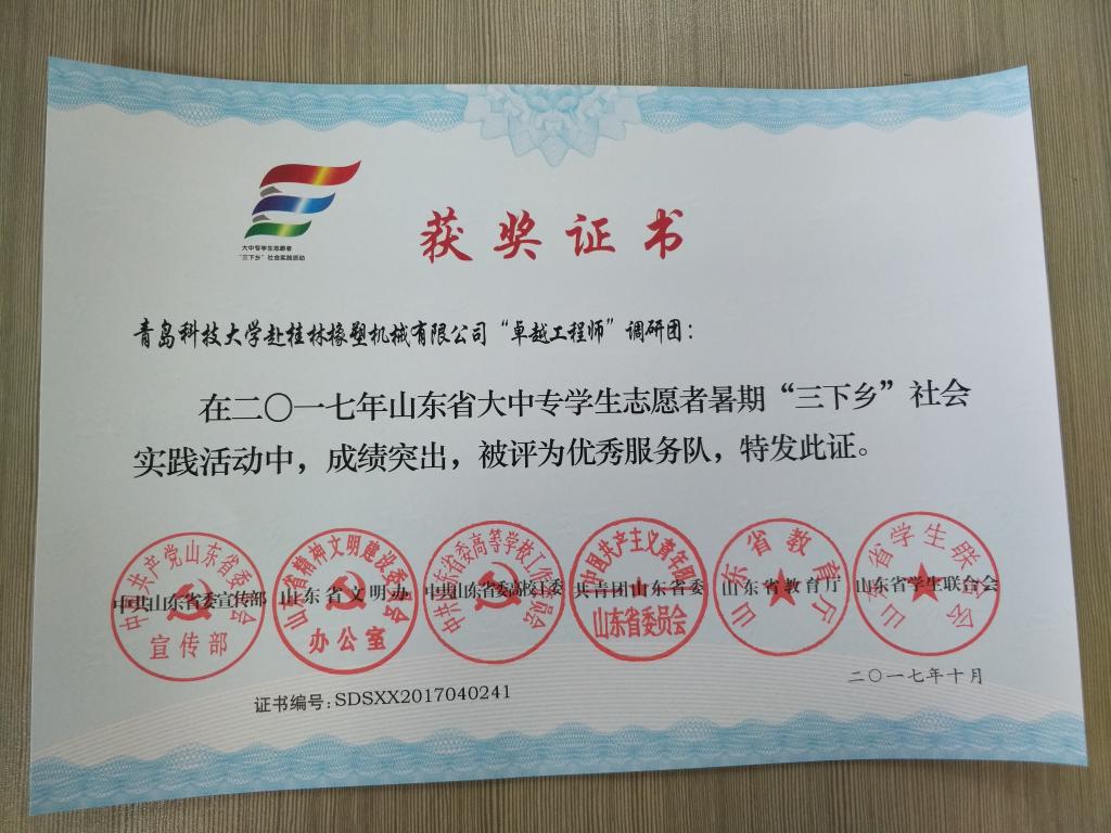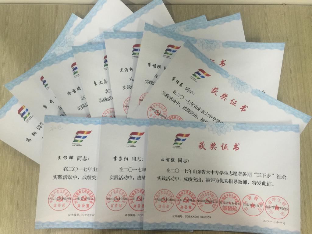 近日,2017年山东省大中专学生志愿者暑期文化科技卫生“三下乡”社会实践活动先进集体和先进个人的证书下发,免费性爱片 赴桂林橡塑机械有限公司“卓越工程师”调研团、赴遵义“红韵传承,筑梦遵义”实践团2支队伍获得2017年山东省优秀服务队称号,王作辉、曲智强、李东阳被评为2017年山东省社会实践活动优秀指导教师,高翔、李开、冷雪靖、李大志、宋沂轩、李福祯、董佳乐7名学生荣获2017年山东省社会实践活动优秀学生。