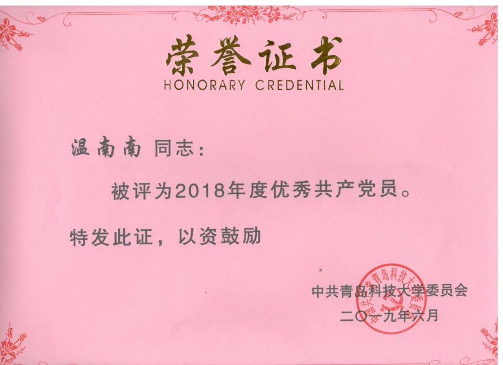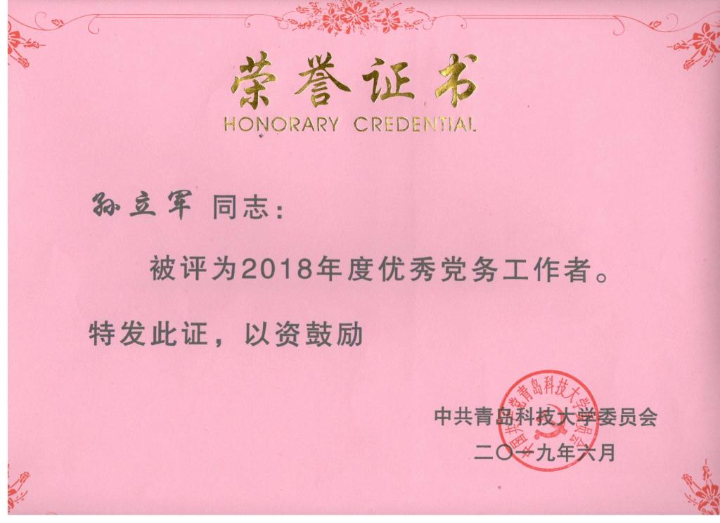 研究生第一党支部获2018年度“五好”示范先进党支部称号;孙立军获2018年度优秀党务工作者;付平(教师)获2018年度优秀共产党员;温南南(学生)获2018年度优秀共产党员称号。