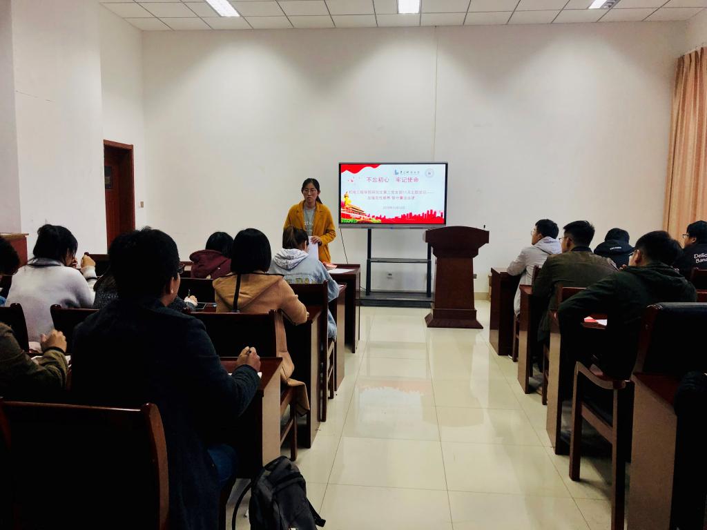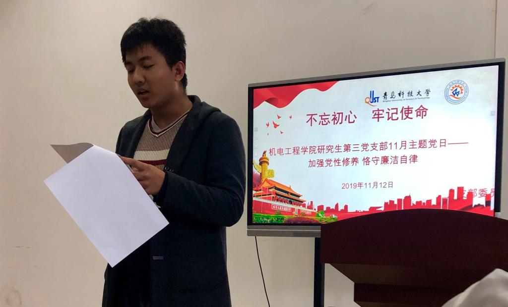 研究生第三党支部在机电楼529会议室开展“加强党性修养、恪守廉洁自律”专题教育活动,会议由学院党总支副书记兼副院长、支部书记王伟主持。