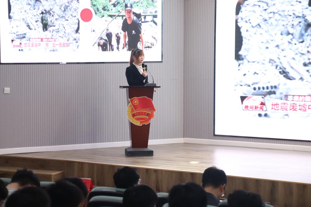 马克思主义学院“习近平新时代中国特色社会主义思想宣讲团”成员魏青和李晶晶分别作了题为《讲好红色故事 传承红色基因》、《五星红旗背后的故事》的理论宣讲。同学们一起赏析观看了《红星照耀中国》。