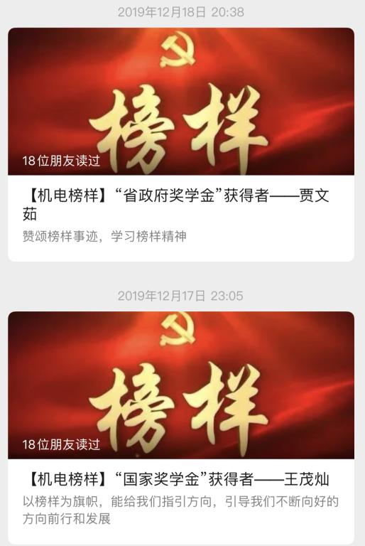 榜样传承精神,先进典型是有形的正能量,也是鲜活的价值观。学院设立“榜Young”系列,宣传了“中国好人”王跃熙、“大智之星”王敏、优秀机电学子刘冰桀等,让机电学子汲取榜样“内在的力量”,向榜样看齐。制作“机电好班长”、“十佳团支书”等专题,让机电学生班干等像榜样看齐,争做合格学生干部。推出“百团百优”栏目,推出150余个班团剪影,增强班级凝聚力。