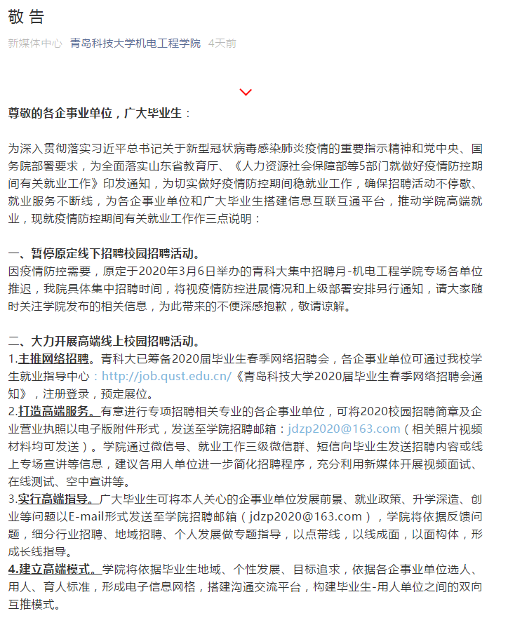 “都是我们的亲学生,关键时刻我们都是义不容辞的加以关怀。”在疫情暴发的时刻,学院成立了疫情防控小组,按照职责分工,依法依规有序推进疫情防控工作,严格执行“日报告、零报告”制度,精确摸排掌握易感师生群体,密切追踪并随时掌握广大师生员工的健康状况。学工队伍每日对37名湖北籍及途经湖北的学生进行密切跟踪,并做好人文关怀、心理疏导,确保每一位机电学子都平安健康。为了“停课不停教、停课不停学”,不影响每一个学子的学习生活,各系老师纷纷主动运用线上教学优势,学习线上教学,保证学生需求。面临就业季,带毕业生的老师也开始线上对即将毕业同学开展一对一就业辅导、发布就业信息,在线帮助同学完善修改简历、不断推进高端就业。通过开展在线心理咨询辅导,为学生开展远程心理援助。