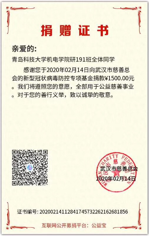 “战‘疫’路上,有你有我,一路同行。”青春战‘疫’的样子还有很多,装控162班崔苏宁同学看到疫情肆虐却急缺口罩、防护服等医用物资时,他心急如焚,用自己的压岁钱向武汉儿童医院捐助4套防护服。省建档立卡户王聪也捐出100元善款,他说:“一方有难八方支援,受到社会帮助的他也应该学会帮助他人”。研究生6个班级共同用自己的压岁钱、积攒的零花钱向武汉慈善总会捐款,为支援“战疫”前线尽一份微薄之力。在防控疫情的关键时刻,机电学子活跃在各个基层,机械中韩164班初梦珠、机械(3+4)161班李世杰、装控183班马江儒、机智181王瑞恒、新能源181马元宇、机械中韩182邵兆坤、机械173班朱洪阳看到家乡防控人手不够,纷纷主动报名参加防控志愿活动,积极投身这场没有硝烟的战场中,用实际行动体现一代青年的责任与担当。