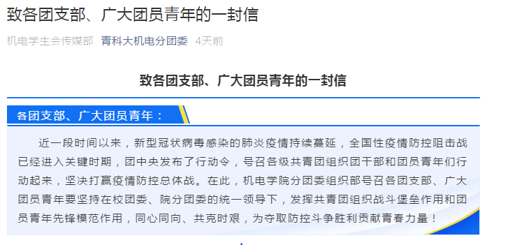 分团委组织部发表《致各团支部、广大团员的一封信》,号召各团支部、广大团员青年要坚持在校团委、院分团委的统一领导下,发挥共青团组织战斗堡垒作用和团员青年先锋模范作用,同心同向、共克时艰,为夺取防控斗争胜利贡献青春力量!号召机电学子服从指挥有纪律、正确发声有作为、履行职责有担当、网络学习由效率。免费性爱片