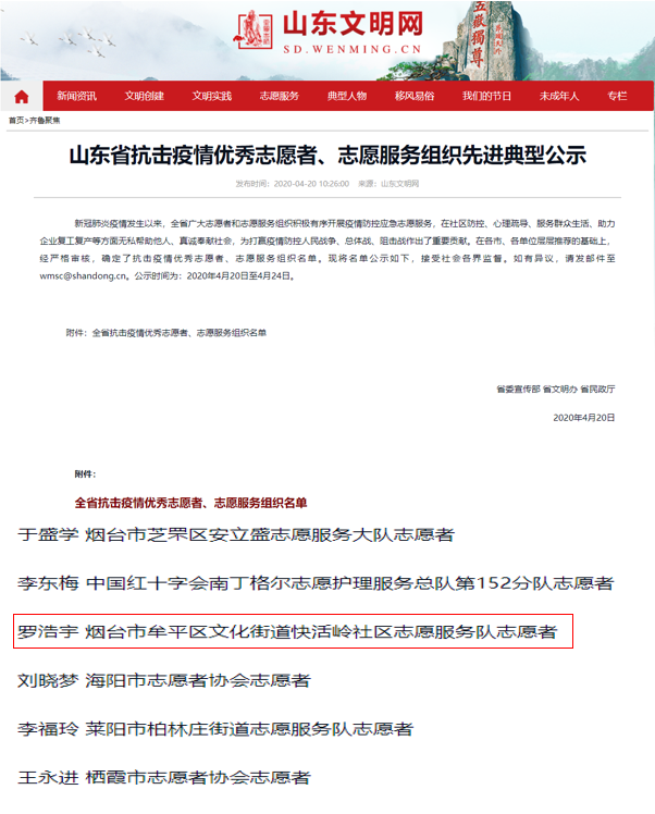 近日,在山东省委宣传部、山东省文明办、山东省民政厅联合公布的《山东省抗击疫情优秀志愿者、志愿服务组织先进典型公示》中,机电学子罗浩宇同学荣获山东省抗击疫情优秀志愿者称号。