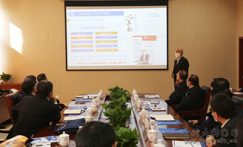 以政产学研融合提升服务青岛贡献度》专题汇报,重点从“强化资源整合,推进一流学科建设”“强化教学改革,提高人才培养能力”“强化创新驱动,深化政产学研融合”“推动成果转化,增强服务青岛能力”等四个方面汇报了学校学科专业建设、人才培养、产学研发展、校地合作等方面的情况,并对下一步主动对接青岛战略规划、服务青岛经济社会发展提出了设想与打算。
