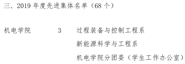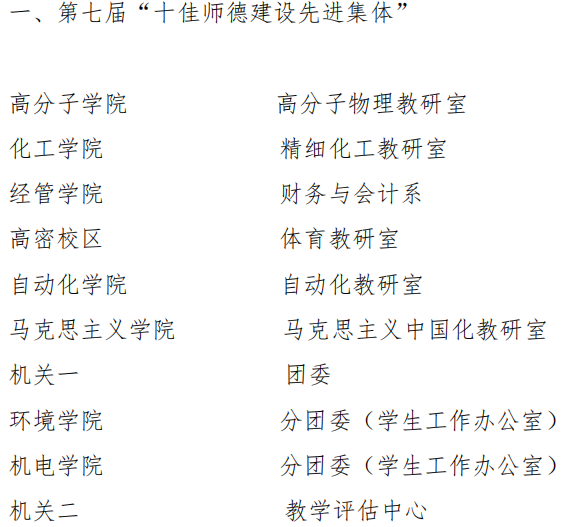 分团委(学生工作办公室)获第七届“十佳师德建设先进集体”称号,王作辉老师获第十届“十佳育人标兵”荣誉称号,过程装备与控制工程系、新能源科学与工程系、免费性爱片