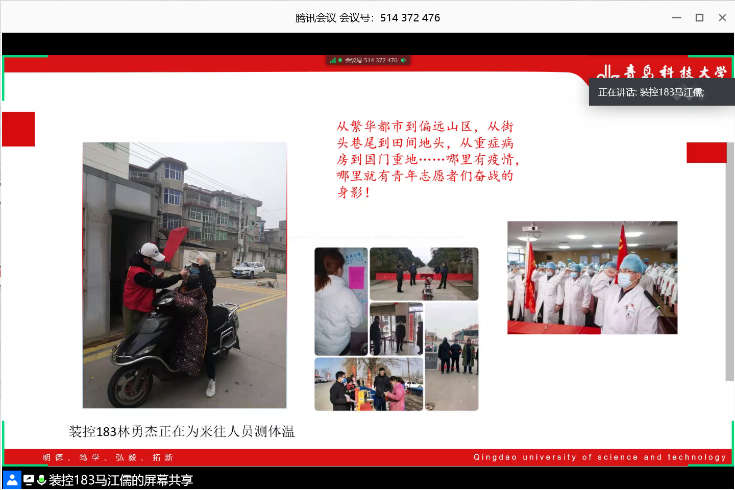 分团委组织部举办“青春在战疫中绽放”线上主题宣讲活动。分团委组织部部长王娟娟老师出席了活动,罗浩宇、刘龙、马江儒和马元宇四位团员作为机电团员青年战疫典型代表宣讲了他们勇战疫情的青春故事,17级、18级、19级200余名团学骨干通过“腾讯会议”参与了活动。活动由分团委组织部副部长张晓楠主持。