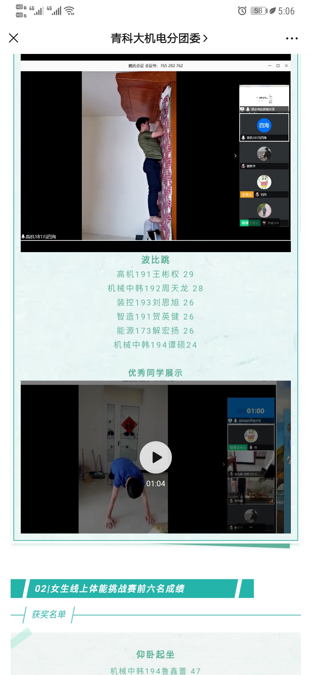 举办了“莘莘学子共庆七十华诞,矫健英姿同战疫疠瘟情”线上体能挑战赛。比赛分男子组和女子组,男子组项目有一分钟俯卧撑、一分钟波比跳、平板支撑;女子组项目有一分钟仰卧起坐、一分钟开合跳、平板支撑,活动中,选手们在家运动,线上比赛,不断强健学子体魄。