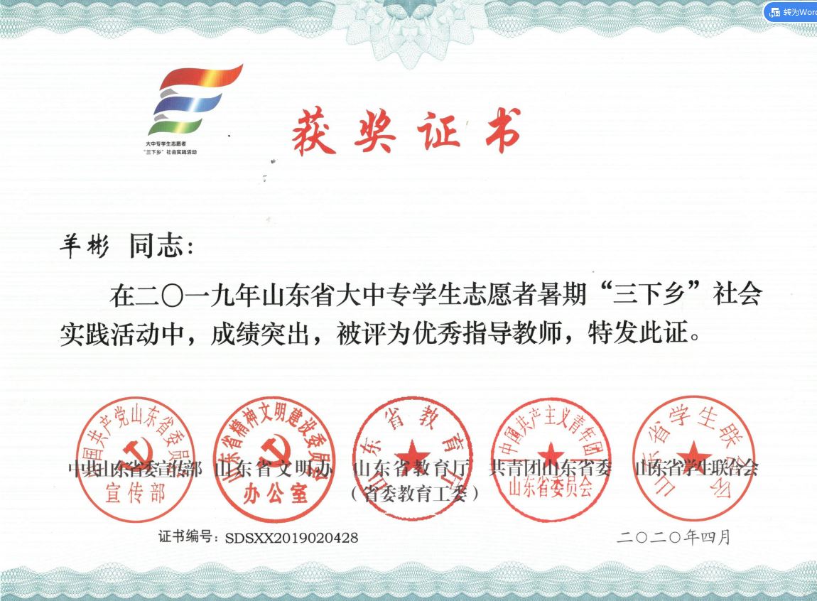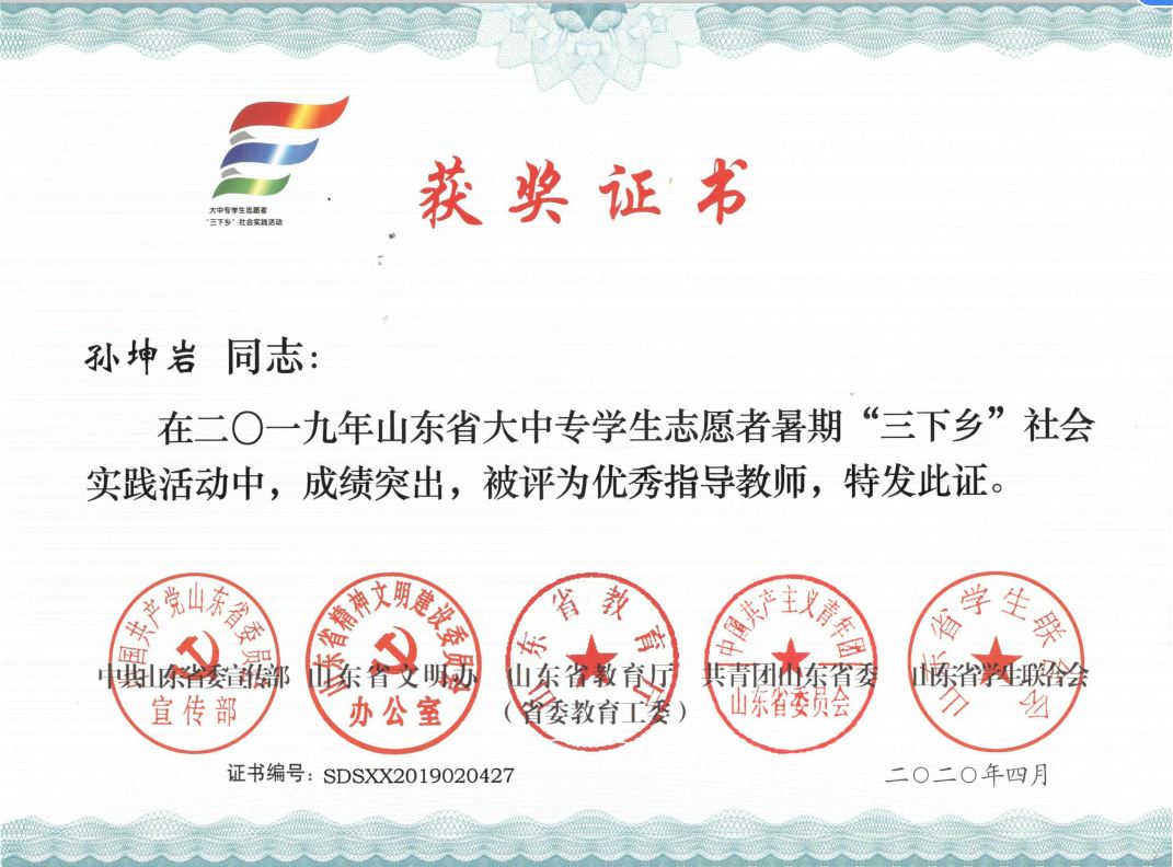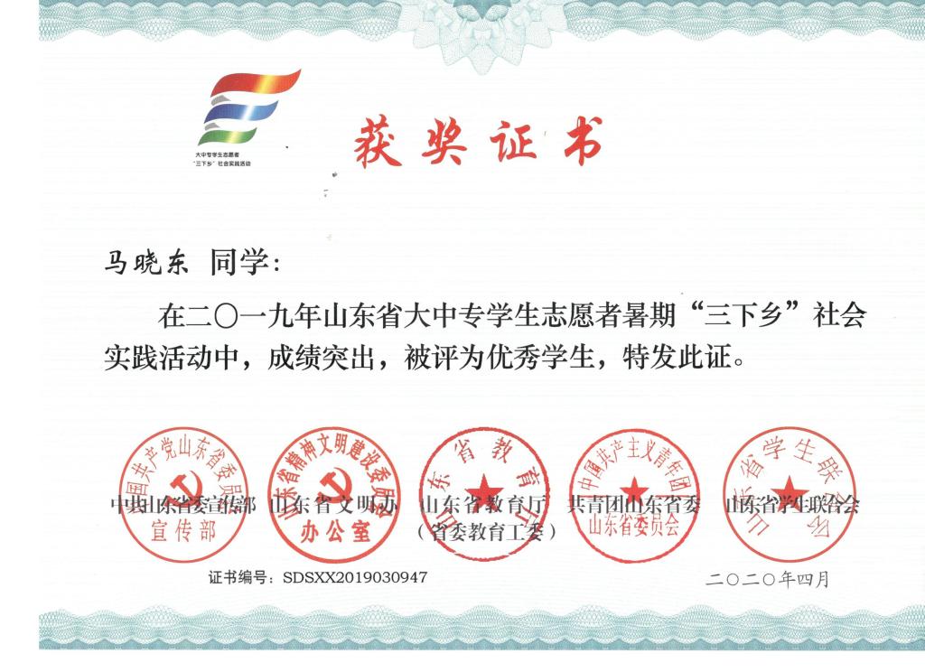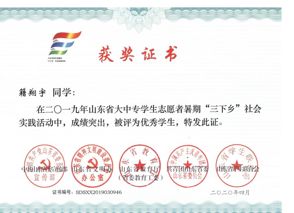 近日,2019年山东省大中专学生志愿者暑期文化科技卫生“三下乡”社会实践活动先进集体和先进个人的证书下发,免费性爱片 “免费性爱片 精准扶贫进程 美丽乡村建设成果”调研团、获“三下乡”省级优秀服务团队,孙坤岩、羊彬获“三下乡”社会实践活动优秀指导教师,籍翔宇、张晓楠、范浩然、马晓东获 “三下乡”社会实践优秀学生。