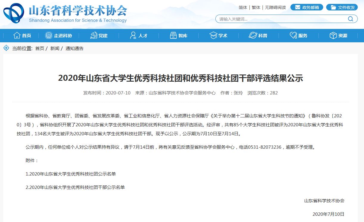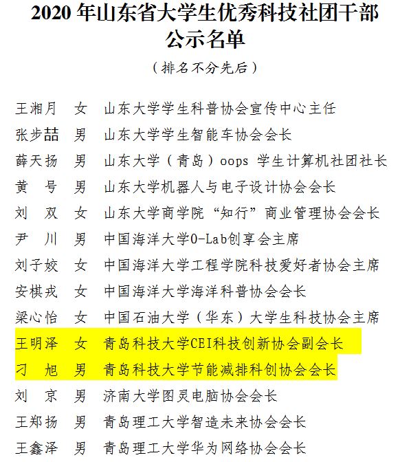 近日,根据省科协、省教育厅、团省委、省发展改革委、省工业和信息化厅、省人力资源社会保障厅《关于举办第十二届山东省大学生科技节的通知》(鲁科协发〔2020〕3号),省科协组织开展了2020年山东省大学生优秀科技社团和优秀科技社团干部评选活动。经评审,共有85个大学生科技社团被评为2020年山东省大学生优秀科技社团,134名大学生被评为2020年山东省大学生优秀科技社团干部。我院刁旭同学名列其中。