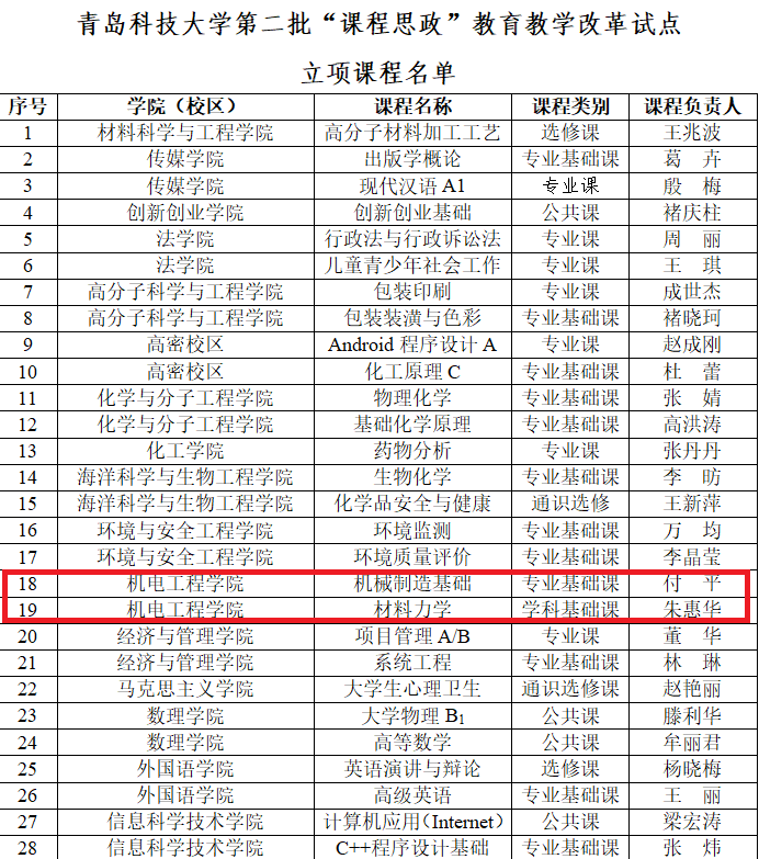 近日,在学校公布的免费性爱片 第二批“课程思政”教育教学改革试点立项课程的通知中,我院付平老师的《机械制造基础》与朱惠华老师的《材料力学》两门课程荣获立项。