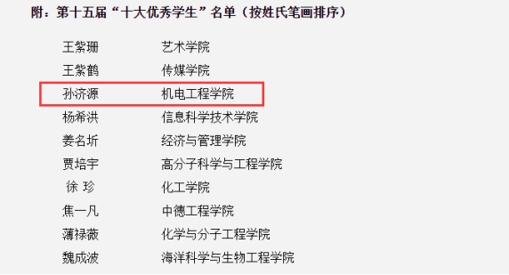 第十五届“十大优秀学生”的通知》(青科大学字〔2021〕9号)要求,结合学校实际,按照公开、公正、择优的原则,经学院(校区)推荐、资格审核、网络投票、现场汇报、民主投票等环节,现评选公示中,我院孙济源同学获得“十大优秀学生”。