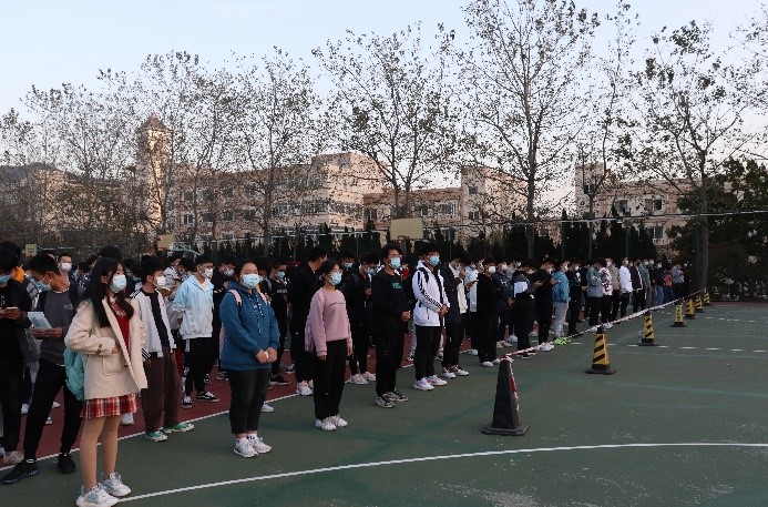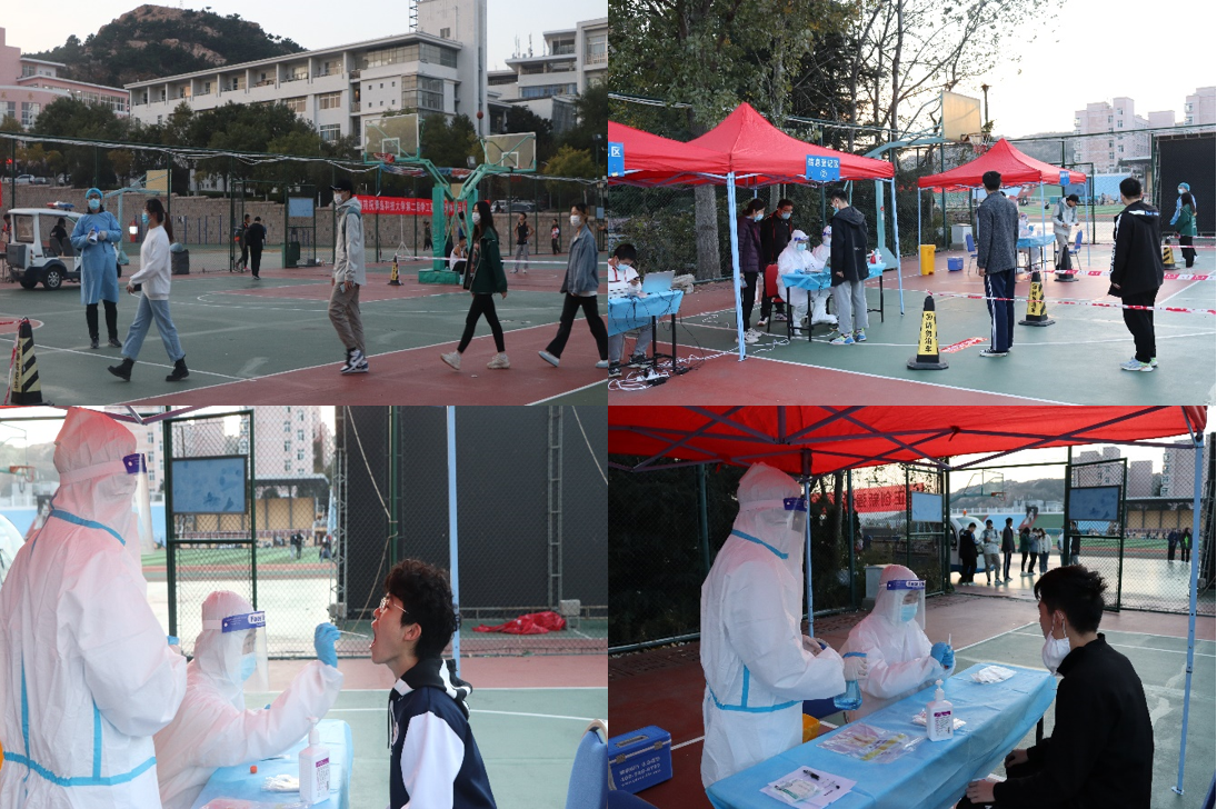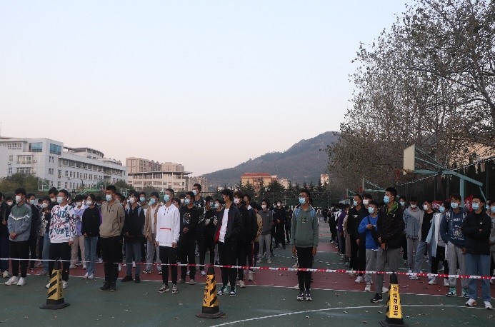 在崂山校区篮球场组织开展了全员核酸检测实战演练。学院组织全体师生积极参与此次核酸检测实战演练,在短时间内将人员聚齐,紧张有序地在警戒线外等候。
