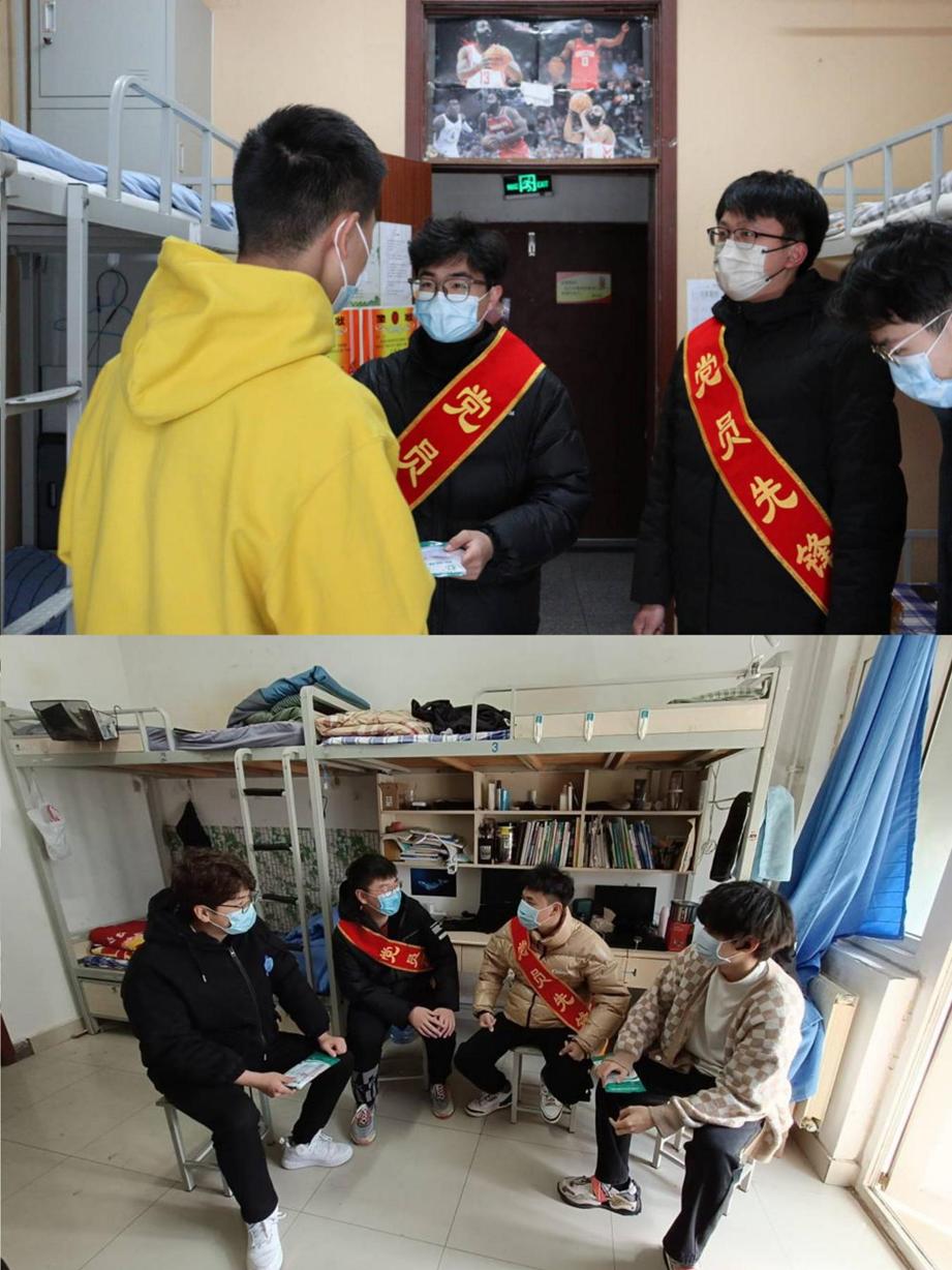本科生第一党支部第一时间成立抗击疫情党员先锋岗。3月19日,支部党员代表在做好疫情防护工作的情况下,到宿舍楼中给同学们送温暖。张致远、王立瓒等同志向21级机械实验、机械中韩、高机、智造专业同学发放医用外科口罩,并和同学们针对疫情之下线上授课的心理变化及学校最新防疫政策等方面进行了深入交流。