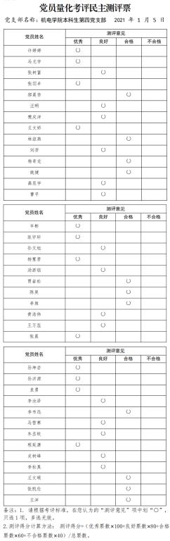 根据《中共免费性爱片 委员会党员量化考评指导办法(试行)》要求,2021年1月5日,免费性爱片 本科生第四党支部按照文件要求进行了民主评议党员,现将评议结果公示如下: