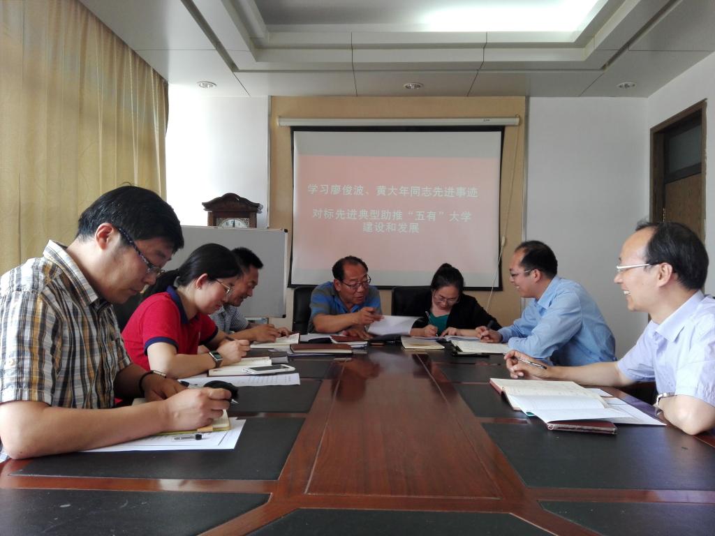 将把学习廖俊波和黄大年两位同志先进事迹融入党建工作中,通过深学、细照、笃行,教育引导全院干部职工以更加坚定的决心、更加昂扬的斗志、更加有作为的状态,投入到学校“五有”大学的实践建设中和“五有”大学的事业发展中去!