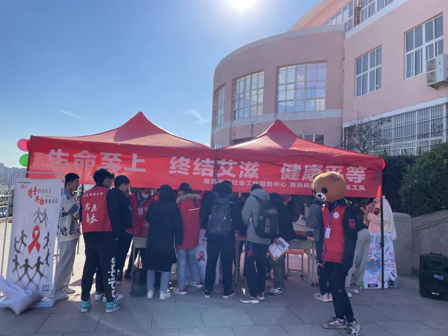 团委志工部青尘义工队的志愿者们冒着凛凛寒风,在学校南苑食堂平台开展了“携手防艾,爱暖寒冬”志愿活动。