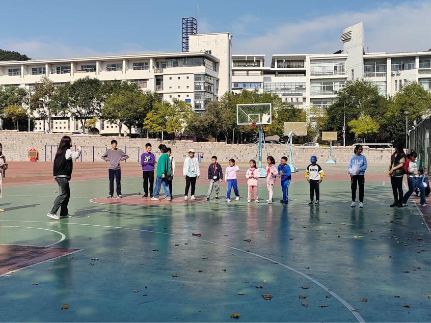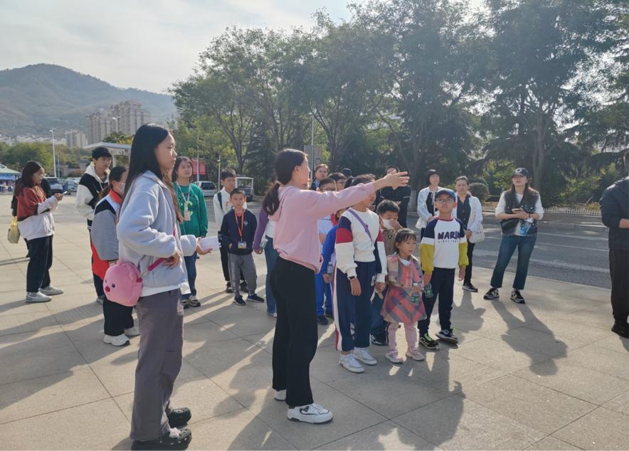 崂山校区东门集合,大学生志愿者们组织小朋友们排好队伍,向其介绍了活动流程和相关注意事项,特别强调游园过程中的安全事项,并要求小朋友们文明游园。