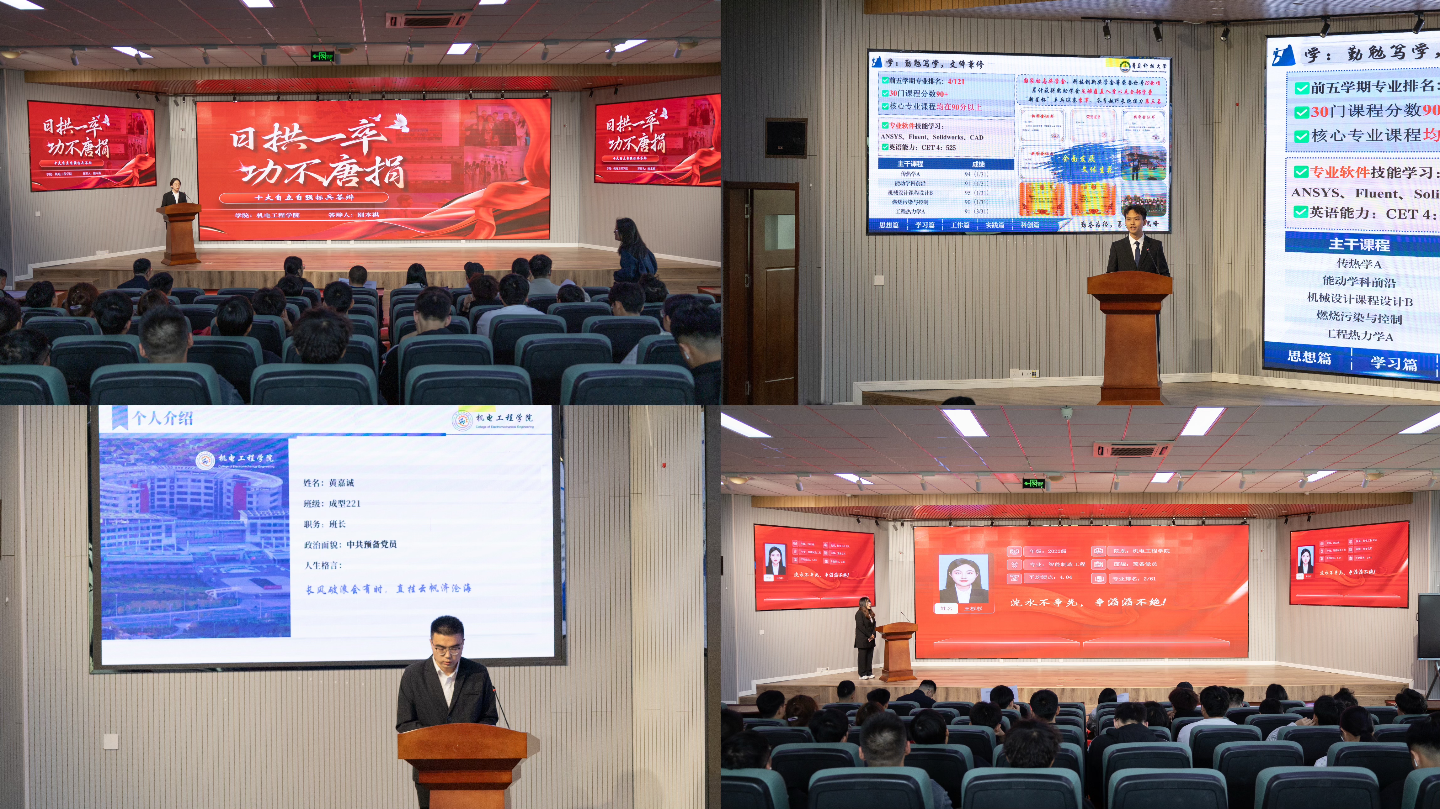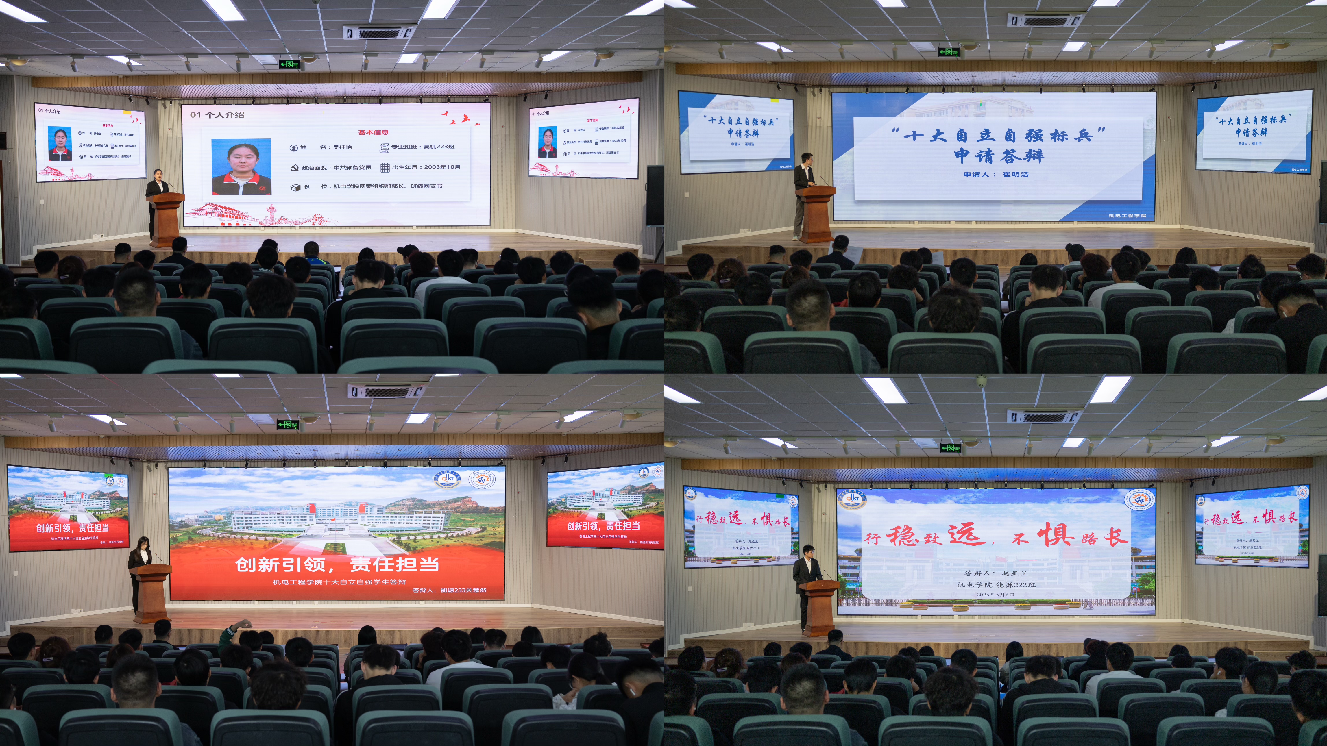 在评审答辩现场,“十大自立自强标兵”候选人按照抽签排序依次进行答辩,候选人通过PPT展示,从理想信念、专业学习、班团建设、学科竞赛、志愿服务等多维度向在场评委、各年级学生代表讲述励志求学的成长故事,展现机电学子志存高远、踔厉奋进的担当与拼搏。这些候选人用行动证明,自立自强不是孤军奋战,只有坚持坚定不移的信念逐梦、筑梦,才是破解“躺平”“焦虑”的青春密码,只有将汗水挥洒在青春篇章,才可以将个人命运与时代需求共振。