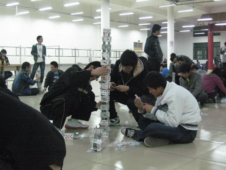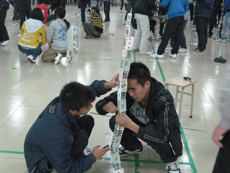比赛采取两人一组,在20分钟内,用一副普通的扑克牌搭出一座高塔,可以借助剪刀,但要保证扑克牌的完整性,以塔的高度为基本评判标准,塔搭完后要求五分钟之内不能倒。比赛在文艺部的精彩舞蹈下开始,选手们各个有备而来,各队队员分工明确,配合默契,充分运用了力学平衡原理和空间结构原理,将纸牌一张张叠加起来,短短几分钟时间,一座座逼真的高塔便拔地而起。同学们的表情不尽相同,有的满脸洋溢着喜悦之情,有的却眉头紧锁,但更多的是谨慎与仔细。真是一场耐心、细心、团结与想象力的综合比赛!经过激烈的比赛,来自高机111班代表队以192cm获得一等奖,与会的评委为获奖的同学颁发证书和奖品。最后,比赛在精彩的扑克牌魔术表演中落下帷幕。