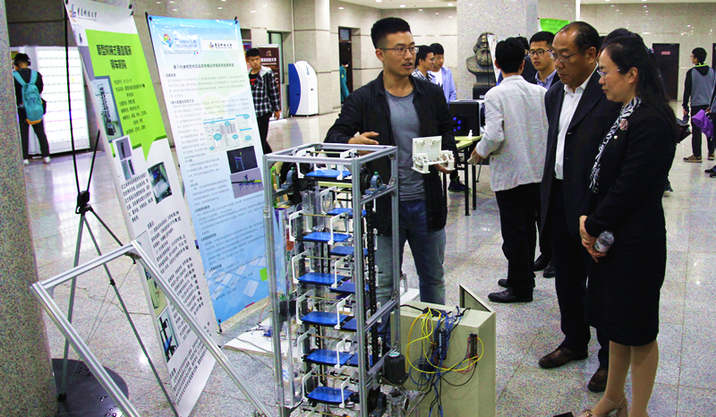 仪式结束后领导们来到图书馆参观展览,本次作品展向大家展现包括了“机器人中心”、“PEC”、“节能减排”和“海狼”四个工作室的作品,积极创新的学生个人的项目和2017工业设计系毕业设计。展览中,参与科创的同学向前来观看的老师、同学们一一详细讲解并演示,认真回答老师提出来的问题,向大家科普各专业的相关知识,也介绍了各优秀作品的创作历程,使大家从不同的角度了解了科创。欣赏过各项科技创新作品后,老师和同学们陆续离开。