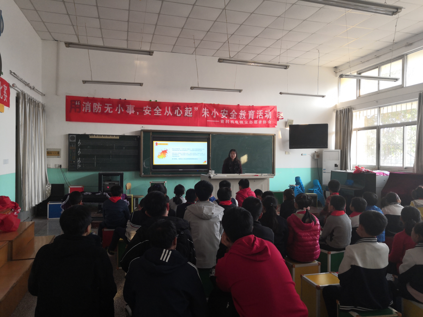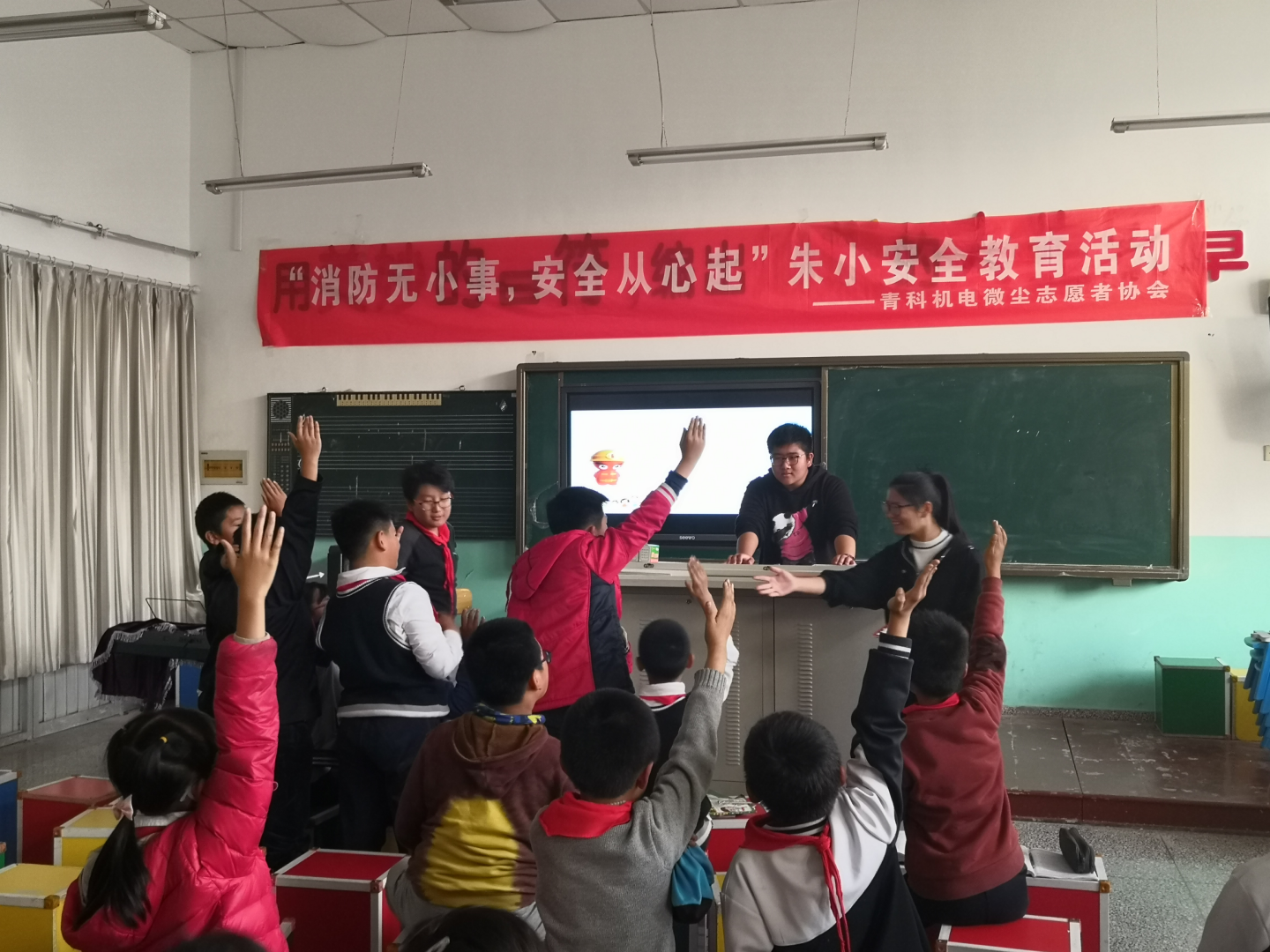 微尘志愿者协会于11月13日下午2:00走进朱家洼小学进行了安全教育活动。众所周知,11月9日是全国消防日。所以志愿者们趁此机会给孩子们讲述基本的防火安全常识和防范措施,带着他们认识一些消防设施。并与学生们进行互动交流,大大提高了小学生们的安全防患意识。更吸引人的是有奖问答环节,孩子们踊跃举手发言,与此同时,志愿者们准备了笔和本子等奖品来奖励那些积极发言的孩子。