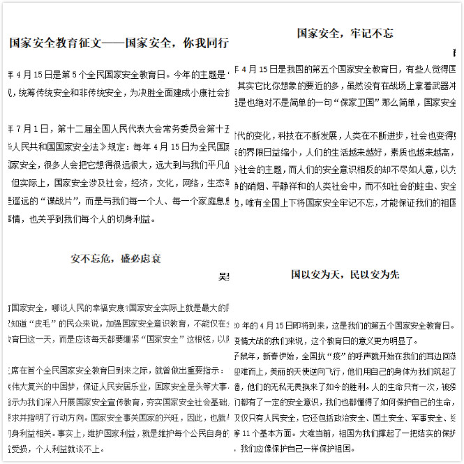 以“青年与国家安全”为主题,组织开展征文比赛,结合学生对于国家安全的所思所想,加强思想交流和碰撞,择取部分优秀文章在微信、QQ空间等平台展示。