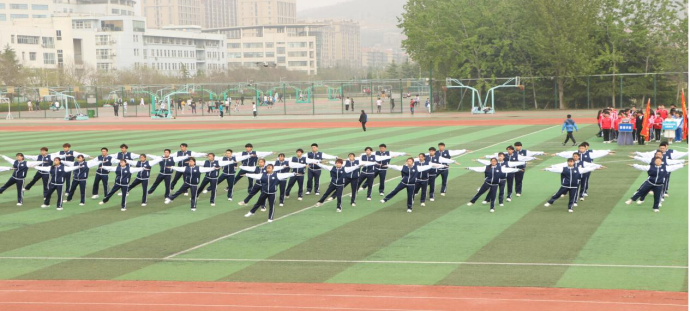 广播操队伍气势高昂、步调一致,动作标准娴熟、舒展自然,取得了崂山校区第四名的好成绩,并顺利晋级决赛。