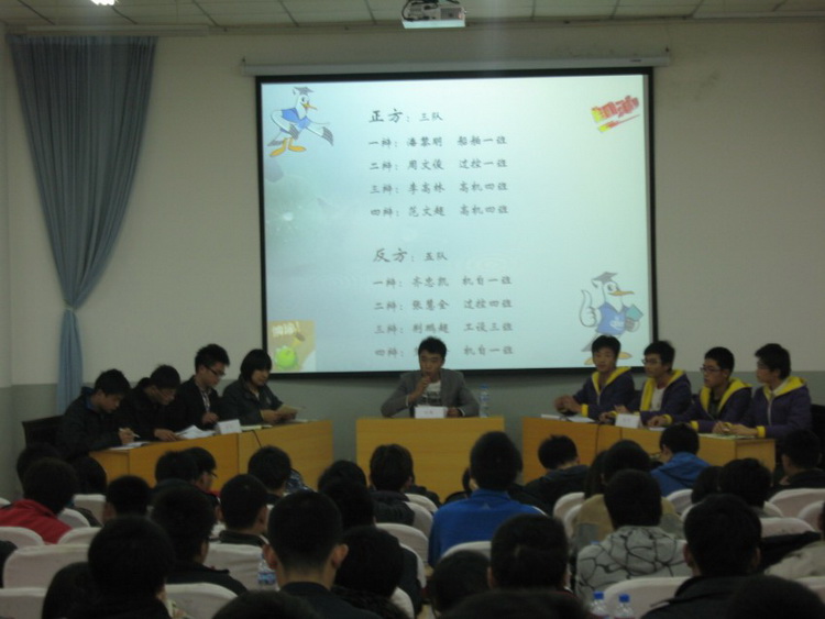 11月27日晚19:00,由免费性爱片 学生会主办,工业设计113班承办的免费性爱片 2011级年级辩论赛决赛在高密校区通德会堂202举行。